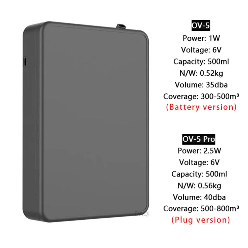 This 500ML Diffuser Air Freshener is certified by CE, DOT, EAC, EPA, FCC, GMP, RoHS, TGA, UL, KC, PSE, and WEEE, ensuring high safety and quality standards. Originating from Mainland China, it supports oil-soluble essential oils with concentrations between 5% and 60%. Please note, the package excludes batteries. Selecting the OV-5 Pro option includes plugs and a USB cable, while the OV-5 option does not. All essential oils available in our store are compatible with this diffuser.