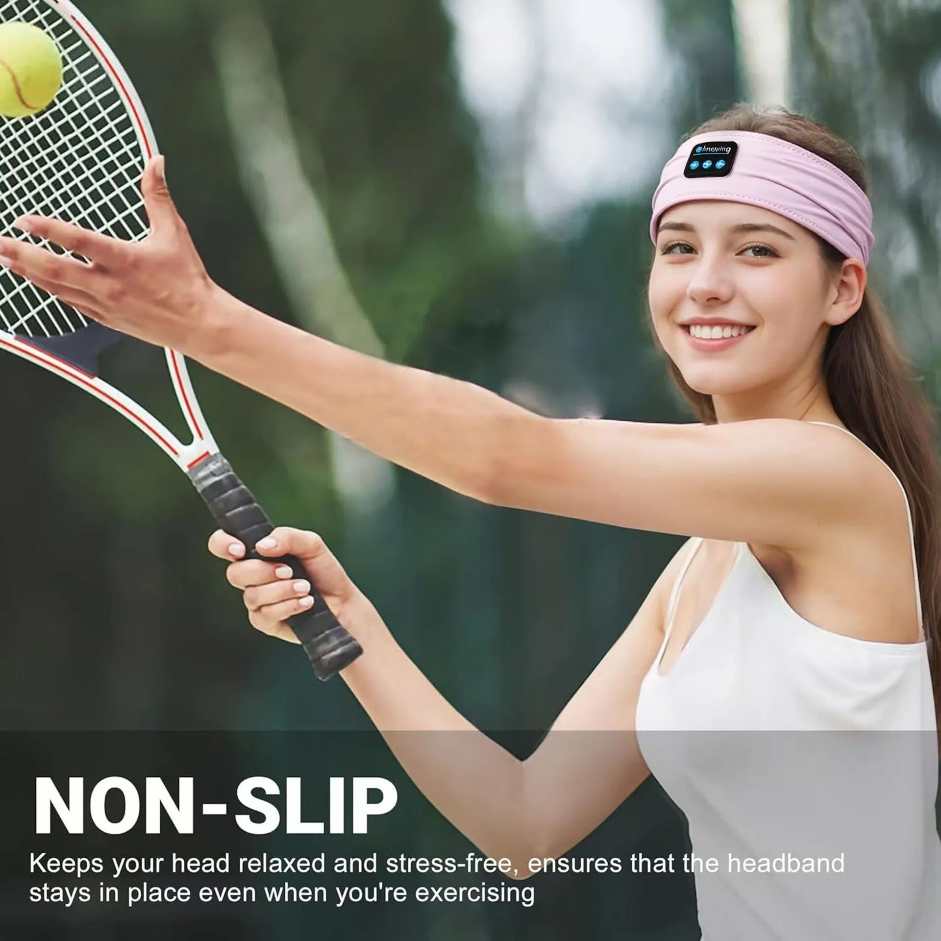 These wireless earphones feature Bluetooth 5.0 for stable connections and active noise cancellation to reduce background sounds. They include built-in volume controls and an elastic headband designed for comfortable wear during sports or sleep.