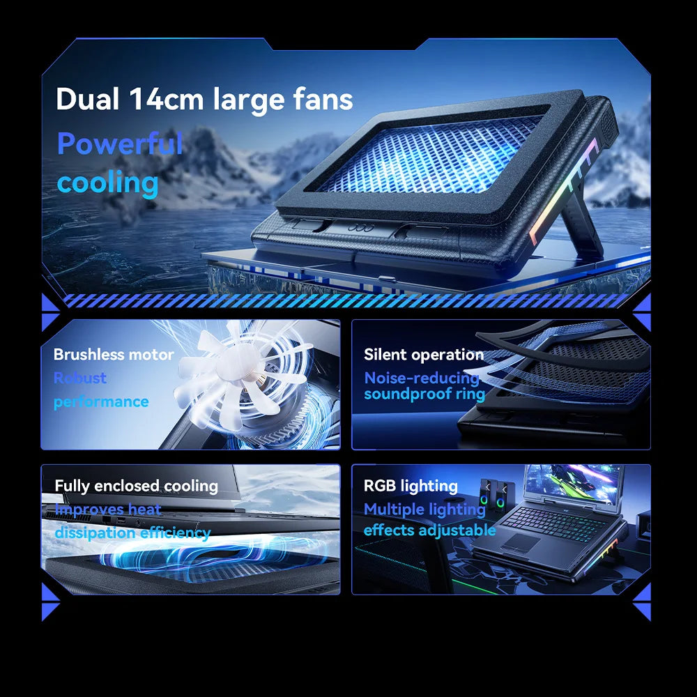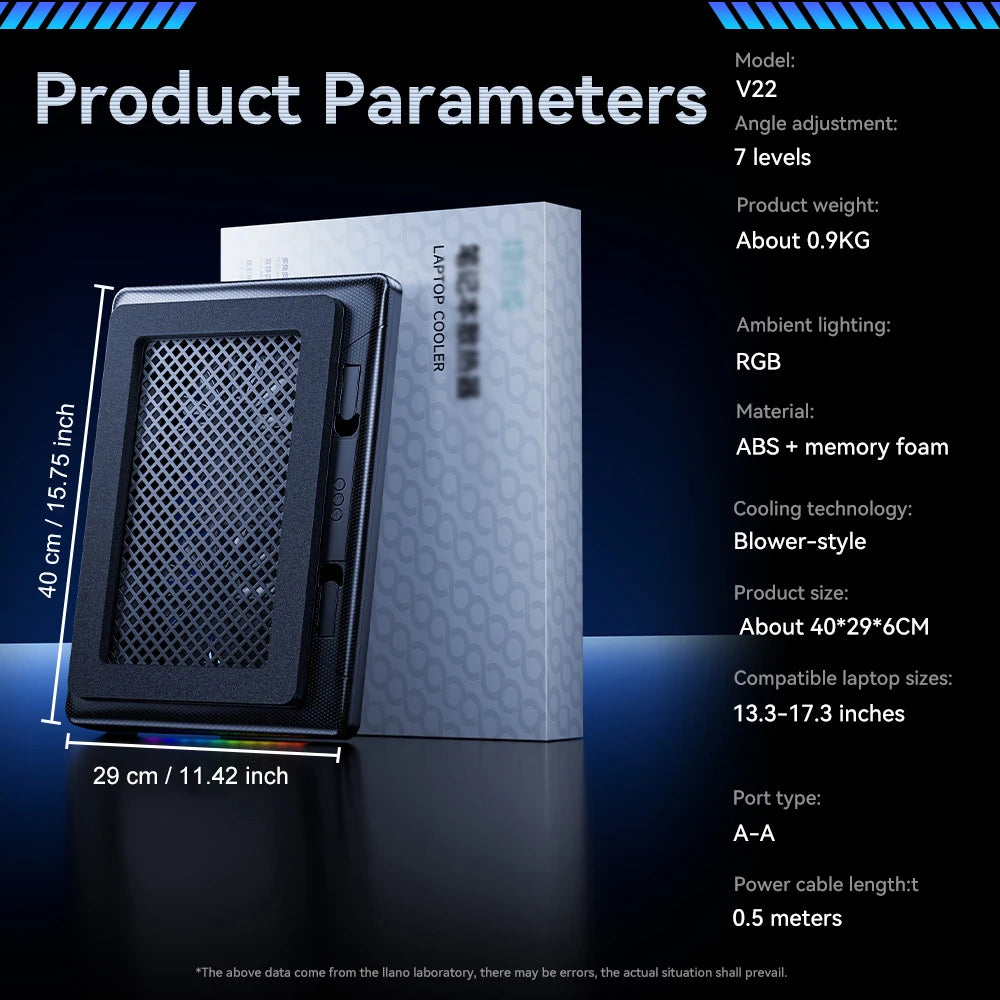 Designed for laptops sized 13.3 to 17.3 inches, this air-cooled laptop cooler features dual fans for efficient heat dissipation. Certified with CE standards and free from harmful chemicals, it ensures safe and reliable performance. The model SV106 includes USB charging capability and RGB lighting, combining functionality with modern aesthetics. Packaged for convenience, this cooler is an ideal solution to maintain optimal laptop temperatures during extended use.