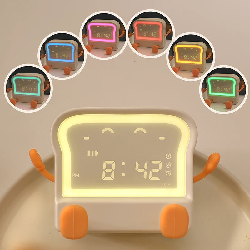This alarm clock is equipped with 3 different sets, and is ideal for use in homes, offices, houses, and warehouses. It features a built-in Lithium battery, a digital LED display, and a digital movement for accurate timekeeping. The clock also includes LUMINOVA and calendar features, and does not contain any hign-concerned chemicals. It is not a smart device and is made of plastic. The power supply is a type-C cable and it has an LED screen. This modern desktop clock is named "Toast Alarm Clock" and is designed in a contemporary, modern style.